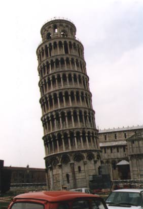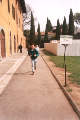 We asked the girls we had met how to get to the Tower. They gave us a look which seemed to betray the complexity of quickly getting from the train station to the Tower and back. Finally, pointing toward one of the streets opposite the station told us to "go down, down, down--then ask!" We did so, and about halfway to the tower we asked another person who was walking down the street. The woman pointed us down another street, telling us to go down it for a bit, "and ask!" (I gather this must be the standard line they give all the tourists.) The third person we asked was a little old man who graciously offered to show us the way. Unfortunately, he moved at about half our pace and time was passing quickly. Finally the old man told us to turn left at the corner and at the end of the street we would find the Leaning Tower. We quickly thanked him and started to run for it. As we were running around the side of the Tower, Ted managed to snap this picture of me reenacting my former days of running cross-country in high school as we dashed down the sidewalk surrounding the Tower.