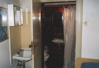 private shower!Ah yes, we were now living in luxury. But before we retired to "champagne wishes and caviar dreams," we were both somewhat in need of a shower. The aforementioned hot water monitor had informed us that "cold showers were free" in her estabishment (of great interest to visiting reptiles), but those warm-blooded creatures who desired hot water would be required to pay-- in advance--the sum of 1,500 lire per 5 minutes of hot water. Having grown somewhat accustomed to hot showers (especially when it's snowing outside), I opted for the ultimate in hedonistic western decadence--a 3,000 lire 10-MINUTE shower! The way it worked was simple--after having paid your money the owner would emerge from her room and sit in her office next to the hot water pump. After the elapsed time had passed on her stopwatch she would flip the switch which I could envision was labeled "ice water/hot water."
